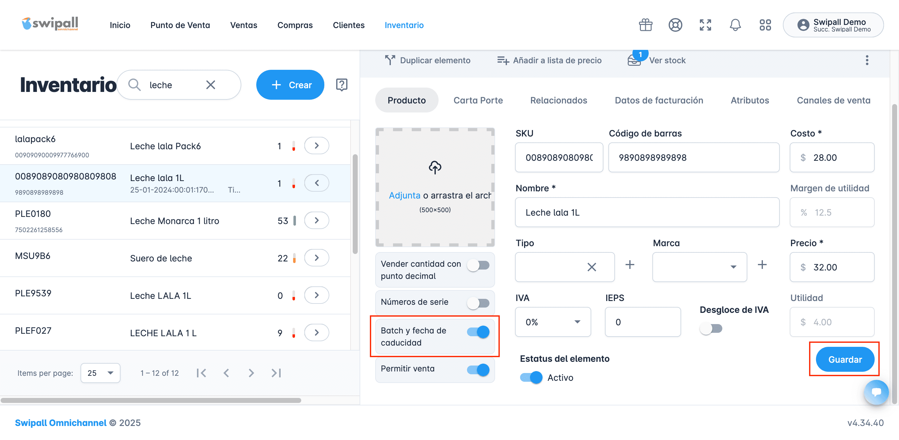 4. Habilite el switch "Batch y fecha de caducidad”